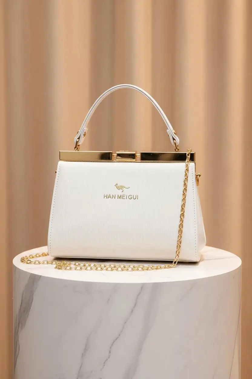 Discover premium sophistication with our stylo bags inspired gold frame handbag – an imported structured bag.